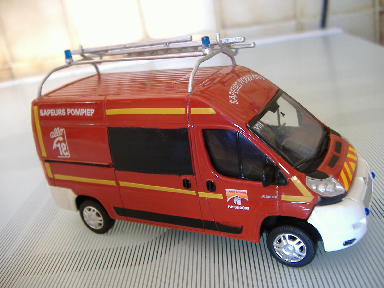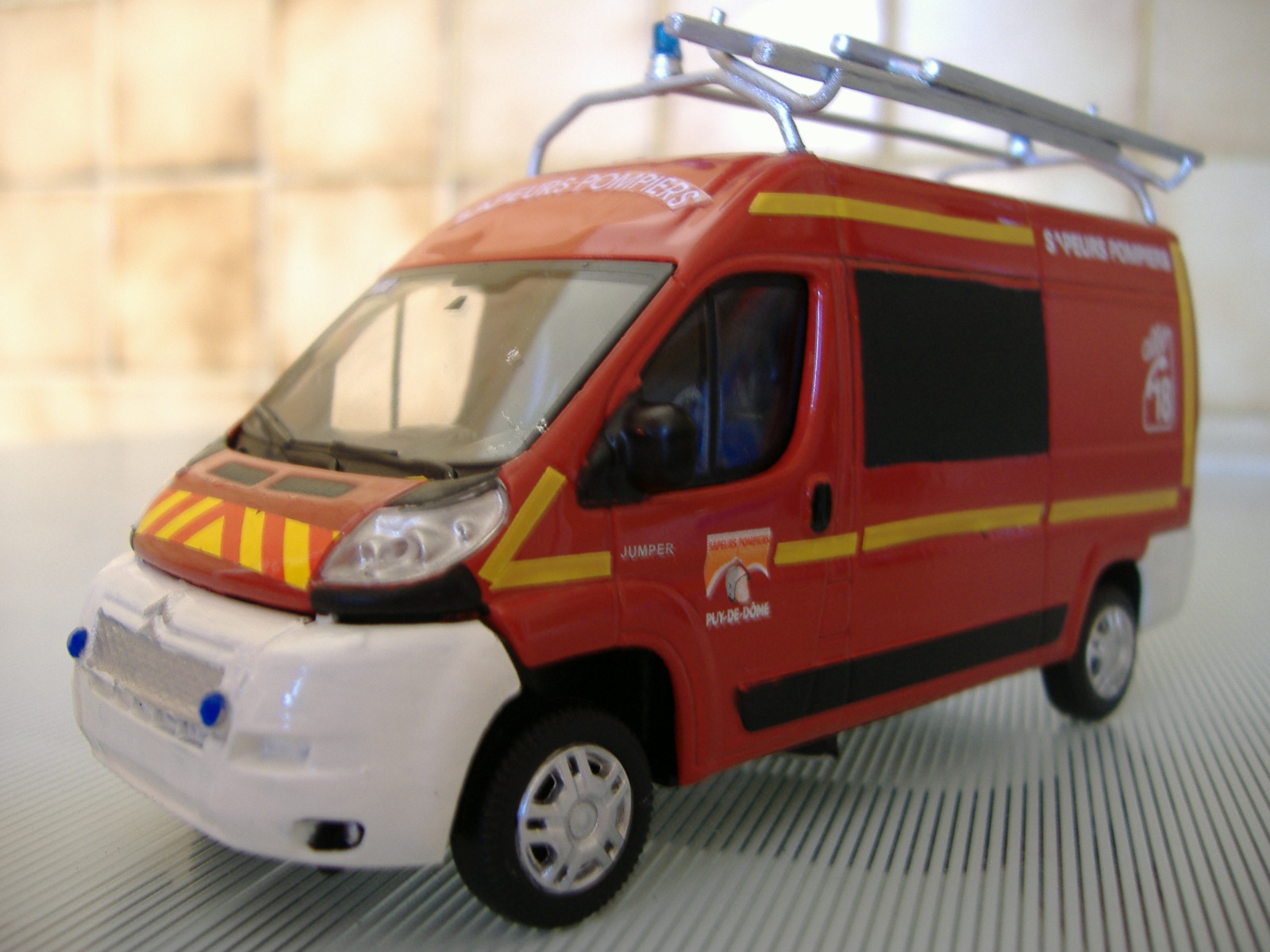 Pour améliorer un peu, tu devrais peindre en gris métal l'intérieur des rétroviseurs, mettres un coup de blanc où sur tes inscriptions "sapeurs pompiers" il manque une "patte" sur le A et le R. Et pour finioler les vitres, passer du white spirit sur la pointe d'un cure dent pour supprimer les quelques bavures.