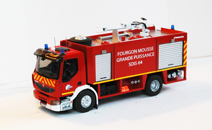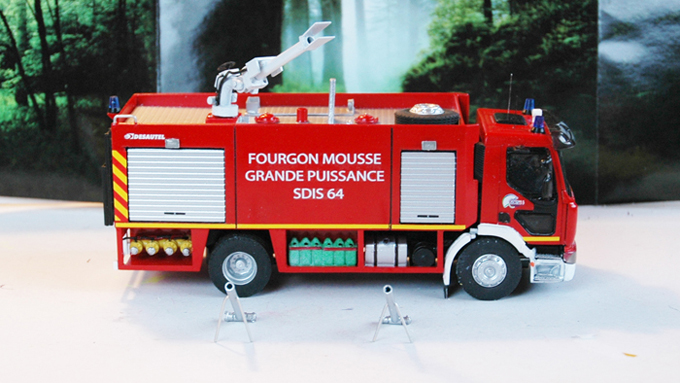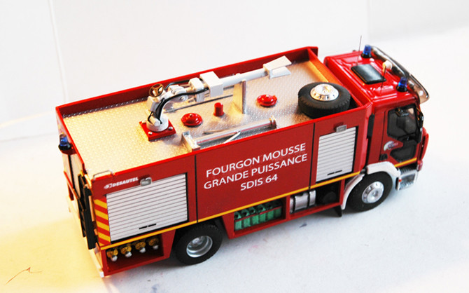 La cabine vient de chez Eligor, le châssis est maison, la caisse arrière est en plasticard de 2 m/m avec insertion de rideau de 1 m/m. Toutes les sorties sont reproduites ainsi que les canons portables. Le plus dur a été de faire la lance-canon télécomandable Ziegler...