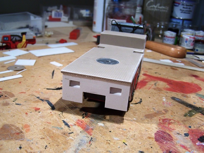 Création du coffre , modification des emmarchements avant , pose d'une plaque de tôle striée sur le dessus du parc et découpe de bandes de 2mm , en épaisseur de celle-ci .